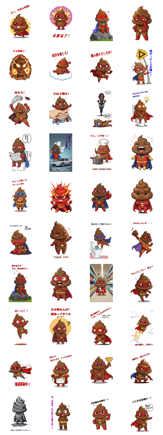 うんこヒーローがLINEスタンプに登場。正義のために戦い、時には笑いも届けるヒーローが、あなたのトークを盛り上げます。個性派スタンプをぜひ使ってみてください。 ※このスタンプはトークルームで大きく表示されるBIGスタンプです。