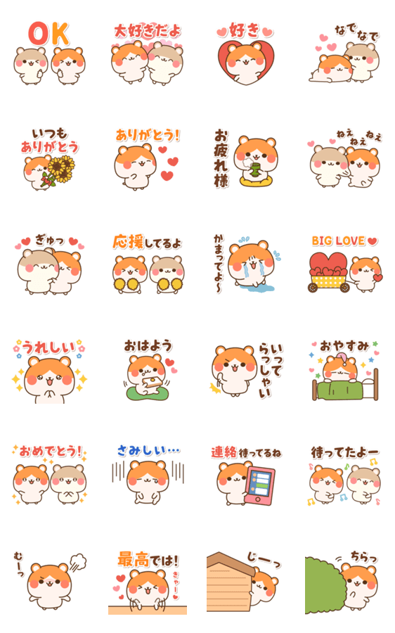 恋人や夫婦で日常で楽しく使える♪大好きな気持ちや感謝の気持ちを伝えられる仲良しハムちゃん達のスタンプです。