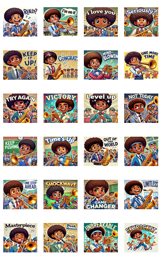 さまざまな感情を表現するアフロ吹奏楽部のスタンプセットです。にぎやかな会話にぴったりです!