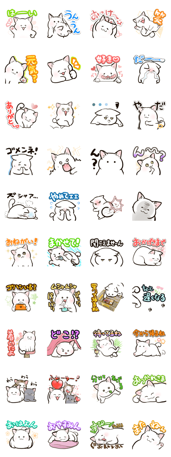 自由でゆるかわいい白ネコスタンプです。 家族や友人とののんびり気軽な会話におすすめ。 ふんわり/もっちり/猫/癒し/ラブリー/のほほん