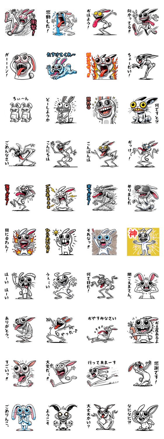 | スタンプ説明 | 癖の強すぎるうさぎが癖になってしまいます❗️コミュニケーションに是非どうぞ‼️ |