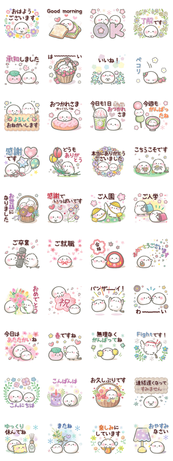 お花がたくさん!春色のスタンプです。ミニおもち、シマエナガ、桜もちも登場。いちごや桜、春のカラーで季節の挨拶に。入園、入学、卒業のお祝いにも使ってくださいね♡