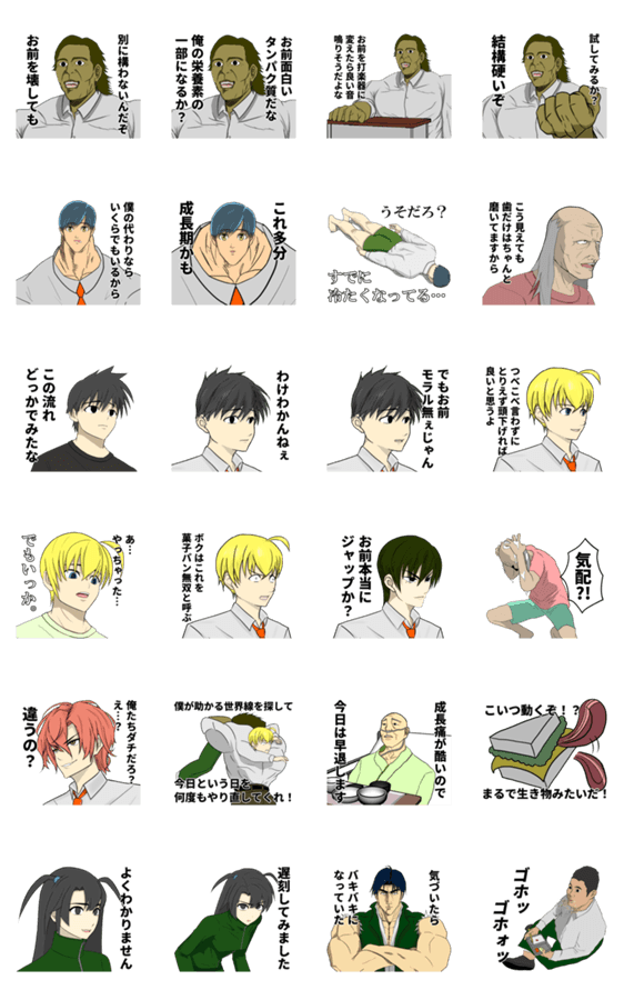 | スタンプ説明 | こちらは、YouTube「須藤近一の非日常」に登場するキャラクターたちの、日常で使えるステッカーです。YouTubeチャンネル「サムのヘタレ英雄譚」に投稿されたものです。 |