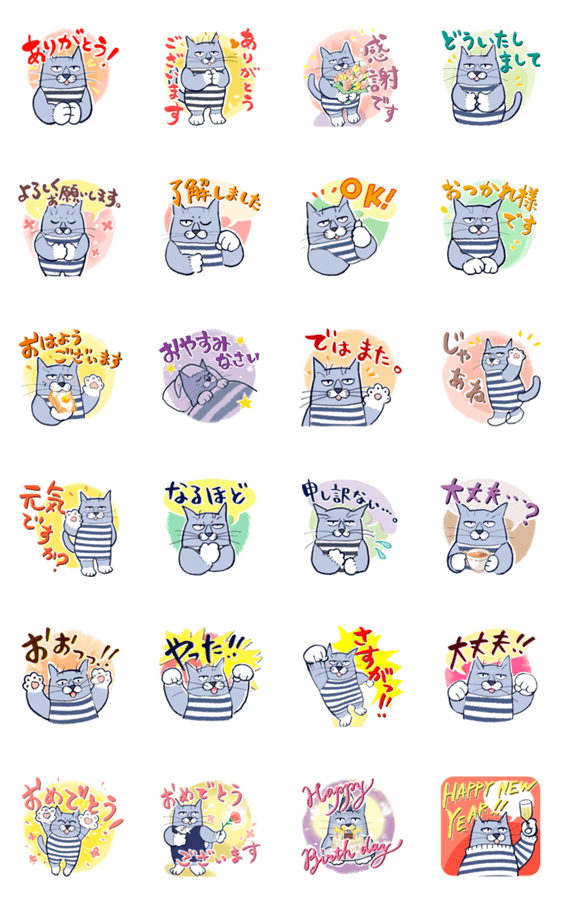 おじさん猫ニャーゴさんのスタンプ。毎日使える定番のほか、お祝い、誕生日、新年に使えるスタンプが入っています。