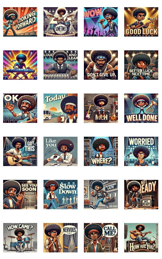 さまざまな感情を表現するアフロバンドマンのスタンプセットです。音楽好きの会話にぴったりです!