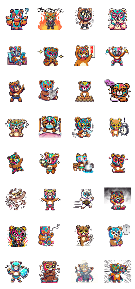プロレスのマスクをしたクマが繰り広げる日常で使えるコミカルなスタンプです。