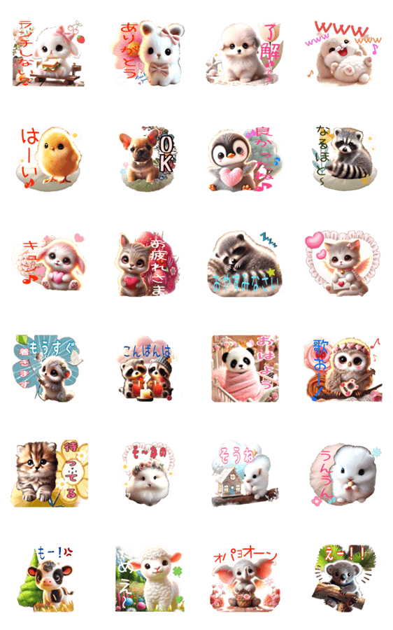 ふわふわもこもこの可愛い動物の赤ちゃんの日常会話のスタンプです。うさぎ パンダ 小犬 子猫 リス 牛 羊 レッサーパンダ AI