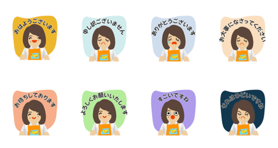 スタンプ説明 エプロンを来た女性シンプルなあいさつ