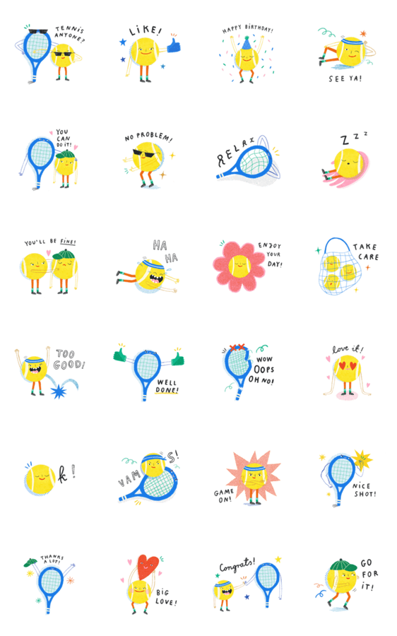 | スタンプ説明 | Tennis, anyone? Ball & Racket と一緒に、毎日を楽しもう! Vamos! Ball & Racket by To The Tennis Court x Kasia Kubacha |