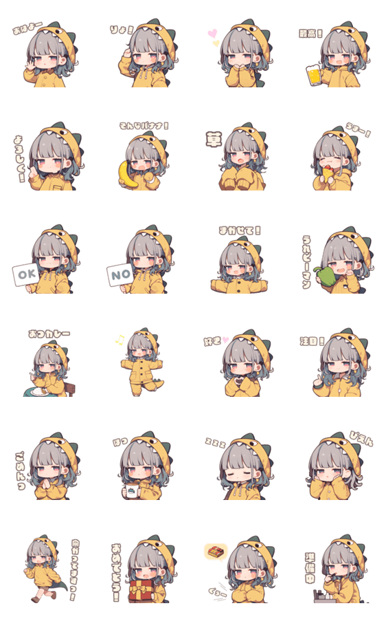 ちょっぴりおじさんっぽくで陽気な恐竜ガールのAIイラストLINEスタンプです。(ゆるい/シンプル/日常/挨拶/かわいい/ギャク)