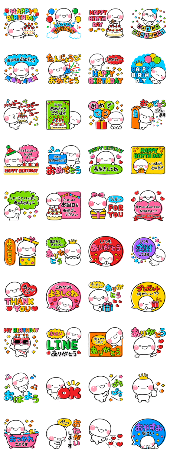 年中使えるみんなのお誕生日をお祝いするスタンプです。しろまるがカラフルポップにお祝いする特別な内容です。ずっと使える内容でスタンプ初心者の方にもオススメです。