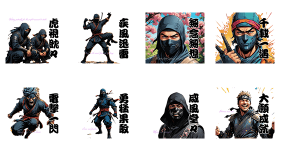 忍者のユニークなスタンプが登場!クールな忍者たちが、四文字熟語であなたの気持ちを伝えるお手伝いをします。英語+漢字の組み合わせで、外国の友達とも楽しく使えるよ。