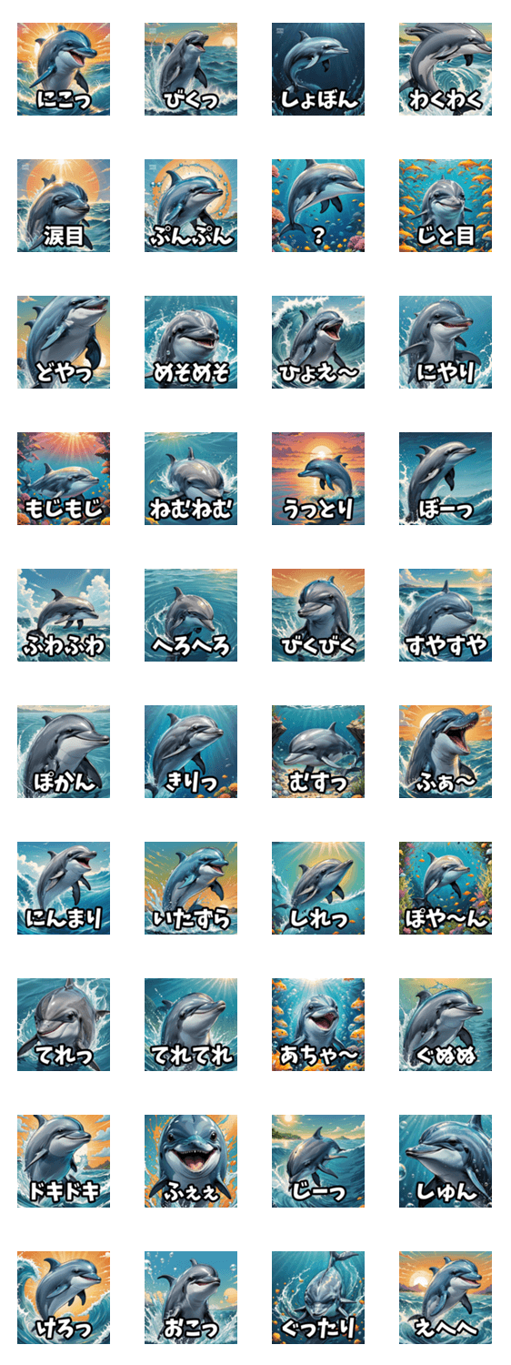 「びっくり!」「にっこり♪」「ぷんぷん!」 いろんな表情のいるかが、あなたの気持ちを代わりに伝えてくれるスタンプです 毎日トークがもっと楽しくなること間違いなし!