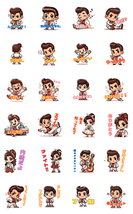 クールなロカビリーマスコットが登場!ツヤツヤのポマードヘアと白いジャケットで、楽しくエネルギッシュなスタンプをお届け!
