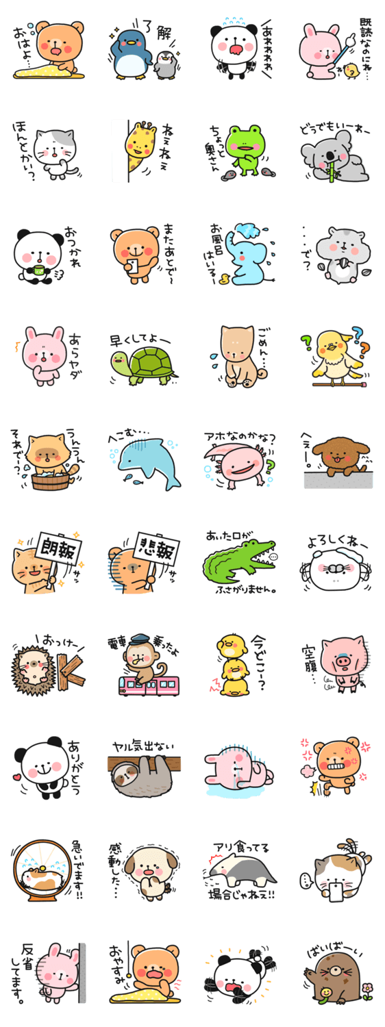 かわいいパンダからウーパールーパーまで、いろんな動物たちをゆるーいスタンプにしました。大事な人やいけすかない人、色んな人とのトークにたくさん使ってください。
