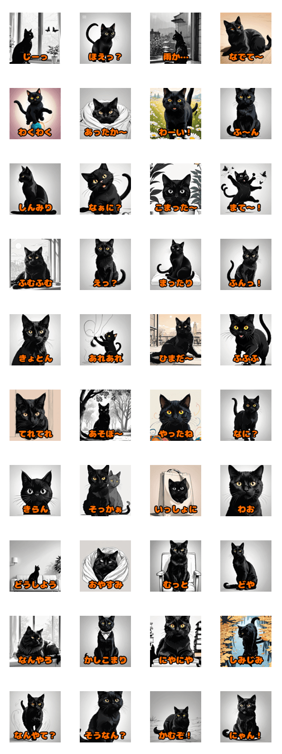 表情豊かな黒猫「みりん」の感情スタンプ! 嬉しい時、驚いた時、しょんぼりした時など、いろんな気持ちを黒猫みりんと一緒に伝えよう!