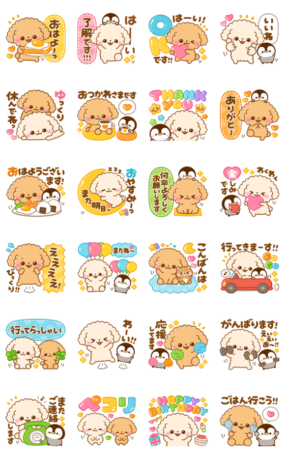 ペンギンの赤ちゃんぺんぺんとトイプードル♡ よく使う言葉を厳選したカラフルで大人可愛いスタンプセットです。