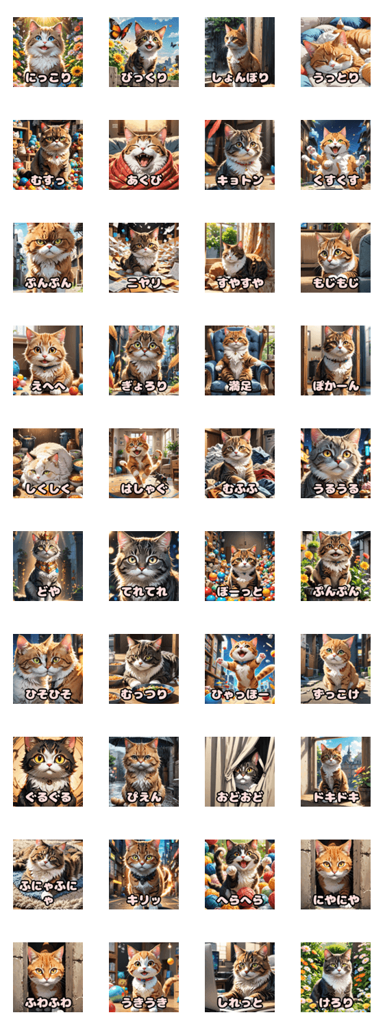 かわいいネコの表情がたっぷり40種類!「ぴえん」「ぷんぷん」「ニヤリ」など、感情を伝えるのにぴったりのスタンプが勢ぞろい。トークをもっと楽しくしよう!