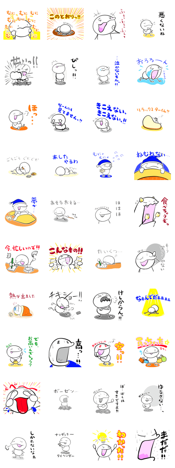 | スタンプ説明 | ほっぺがむにむにのぼうにんげんくんの、のんびりしてたり忙しかったら戦っていたり、そんな毎日をいろどるスタンプ40種! |