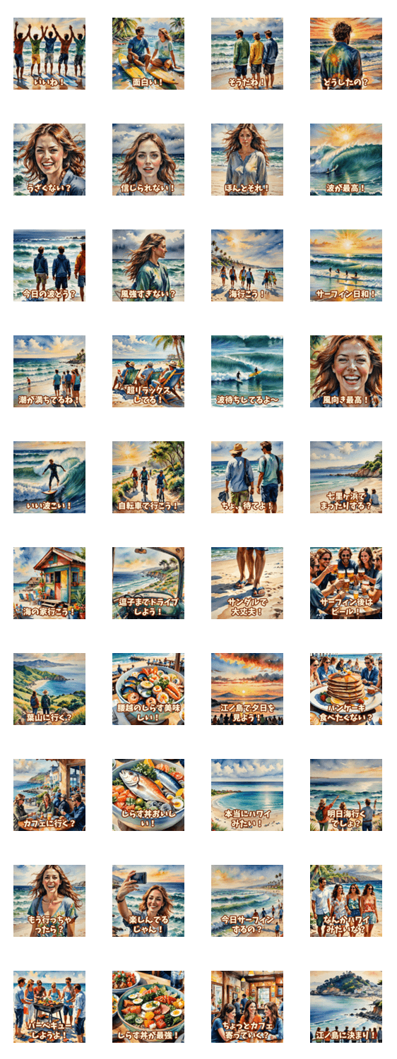| スタンプ説明 | 「波ヤバい!」「海行くべ!」など、湘南のノリを詰め込んだLINEスタンプ! サーファーっぽい言い回しや、湘南っ子が日常で使う言葉をスタンプにしたよ! |