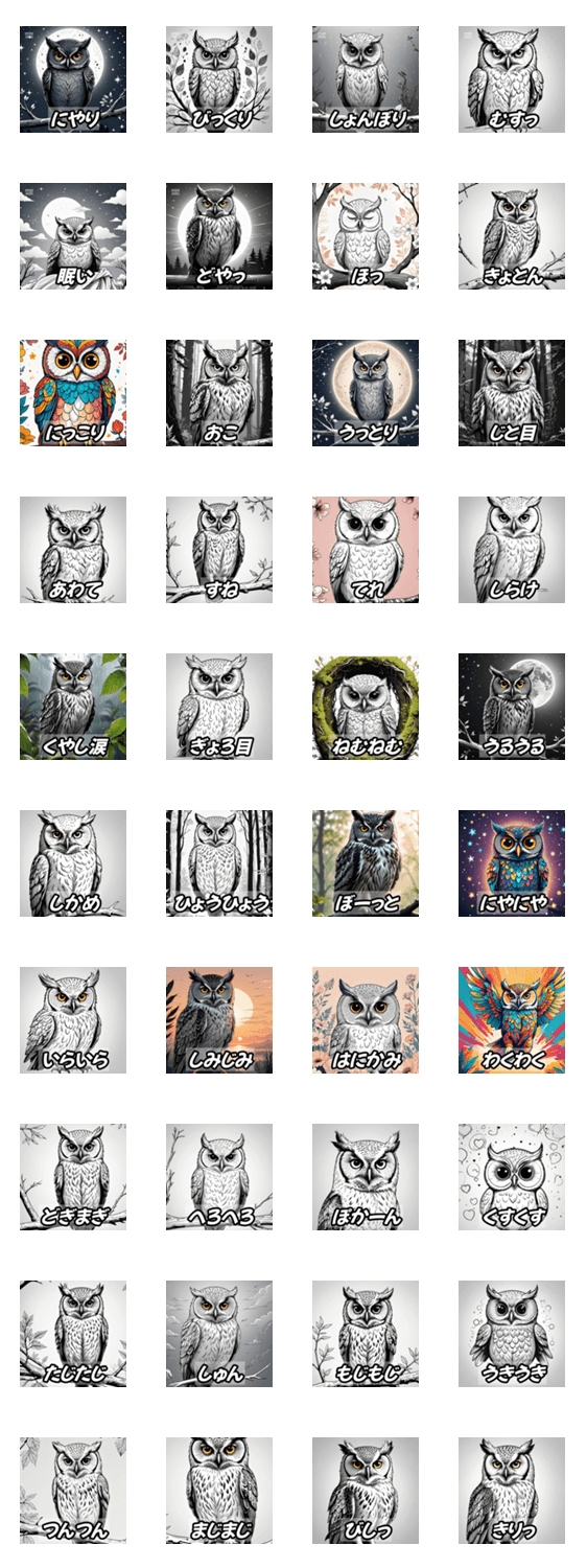 フクロウがあなたの気持ちを代弁!にやり、びっくり、しょんぼり…いろんな表情のフクロウでトークを盛り上げよう! 普段使いからちょっとユーモアのある返事も