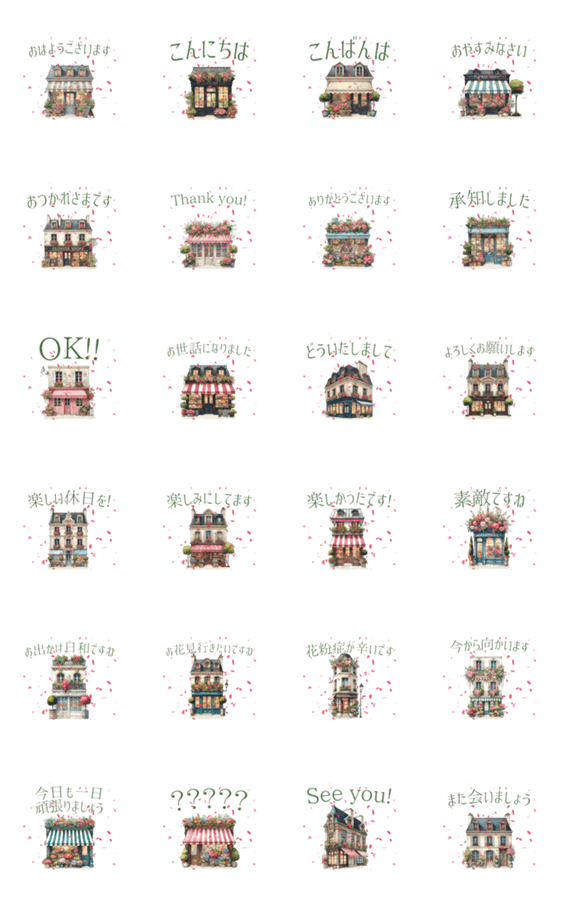 薔薇の花びらが舞う春爛漫のおしゃれな花屋です。敬語多めで英語もあり。花いっぱいのナチュラル大人可愛い動くアニメーションスタンプ。自然/癒し/グリーン/cute/水彩画OK