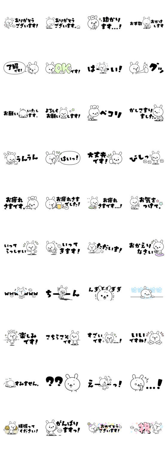 ひねくれうさぎシリーズ第33弾!トーク画面を邪魔しないよう長細く作った省スペースのスタンプです。日常会話で使いやすい敬語のセット。なんかまるいのもいるよ。