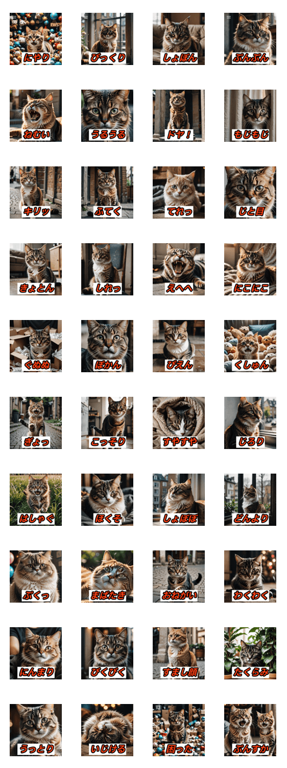 かわいくて表情豊かなネコたちのスタンプセット!嬉しい、怒る、眠い、びっくり…いろんな気持ちをこのネコたちが伝えてくれます。