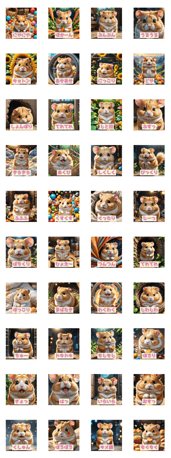 にやにや、しょんぼり、ぷんすか…いろんな気持ちを伝えるかわいいハムスターのスタンプです。トークを表情で彩ろう!