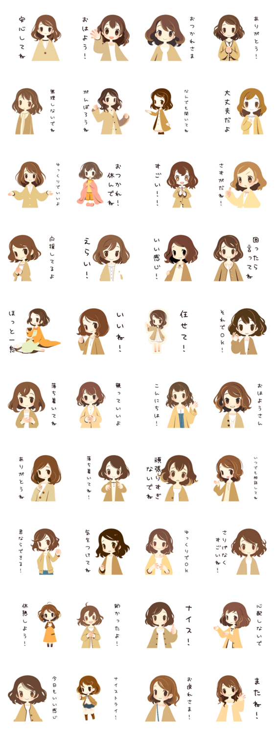 丁寧な言葉遣いと穏やかな笑顔が特徴のスタンプセット。職場や学校で感謝を伝えたり、悩みを聞いたり、さりげない気遣いを表現するのに最適。