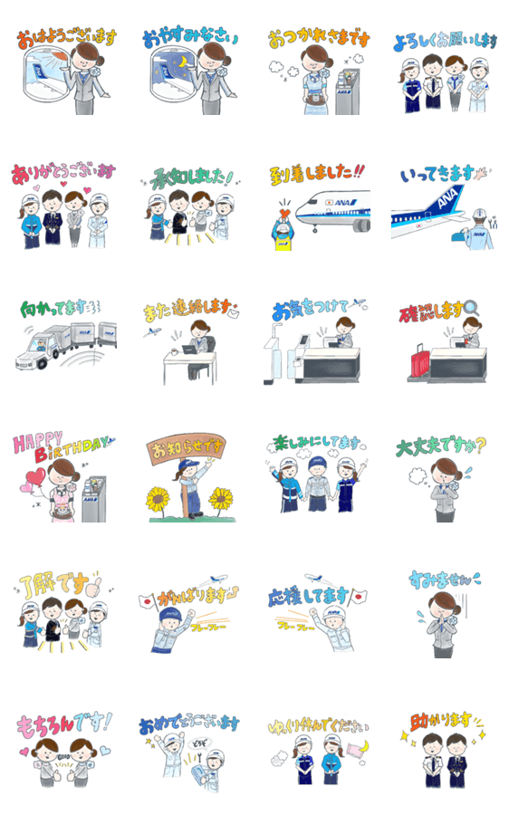| スタンプ説明 | ANAで働く様々な職種を描きました!航空業界で働く人も、それ以外の人も幅広い世代に使える、ゆるかわ敬語スタンプです。 |