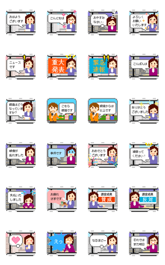 ドット絵のニュースキャスター点子さんのスタンプ。ピコピコ動きます。挨拶、お知らせ、近状報告などにどうぞ。レトロな感じ&現場の未確認飛行物体つき。
