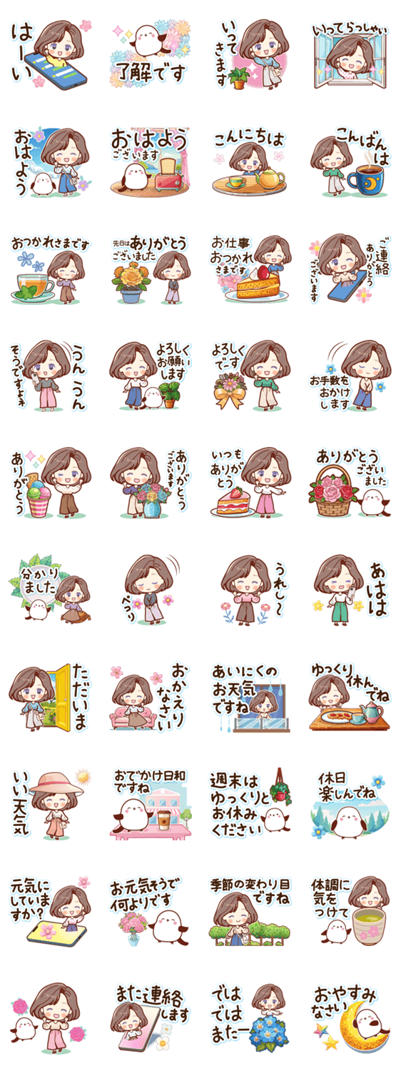 大人の女性にオススメ♪人気の可愛いシマエナガといろんな返信が返せます♪挨拶/天気/梅雨/お祝い/春夏秋冬/敬語/女子/主婦/ママ友/シニア/職場/家族/ボブヘアー/鳥/花