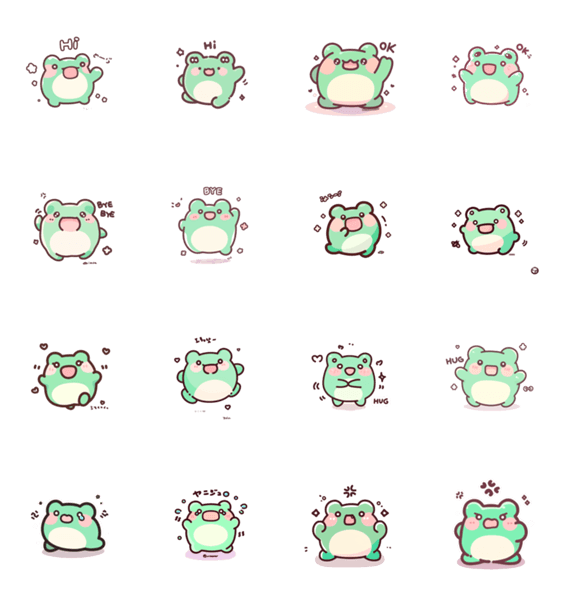 フロッピーをご紹介!パステルグリーンの愛らしいカエルです。手を振ったり、食べたり、ハグしたり、かわいい表情でチャットを楽しくします!