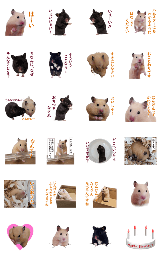 かわいいハムスターの写真スタンプです。 2匹のハムスターが人間の言葉をしゃべっています。