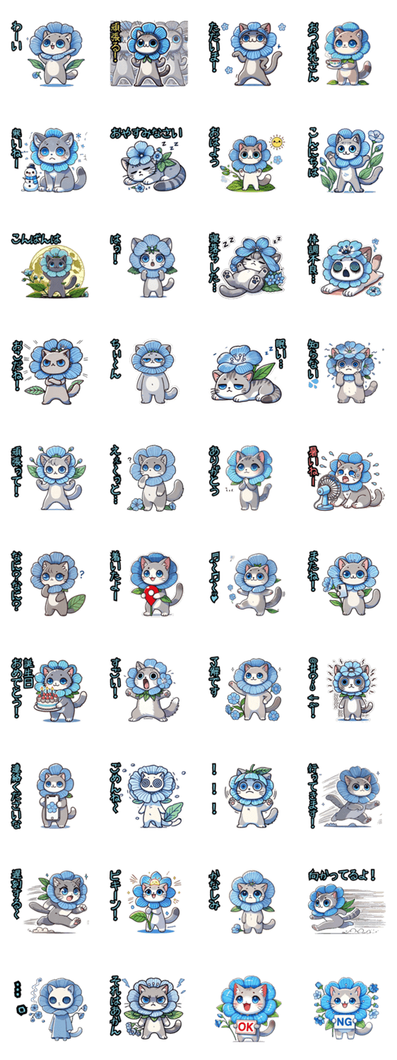 | スタンプ説明 | 大好評‼️花猫シリーズに新しい仲間が増えました❗️青のネモフィラにグレーのにゃんこがマッチして可愛ゆす♡ |