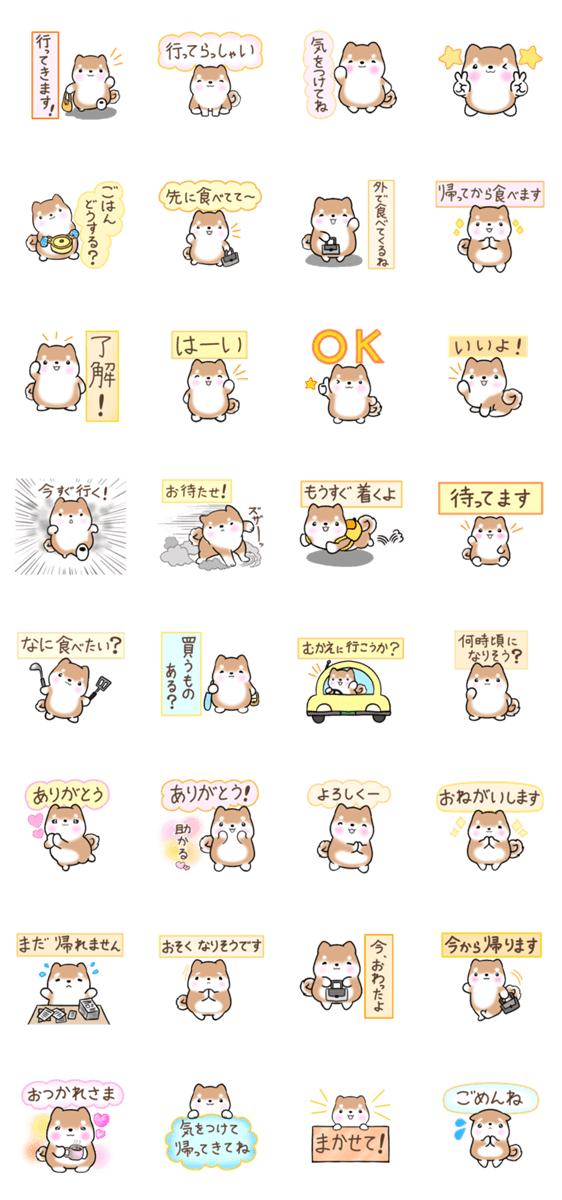 大切な家族と連絡を取り合う際に使う言葉やお返事などを集めた、ほっこり可愛い豆柴犬のスタンプです。