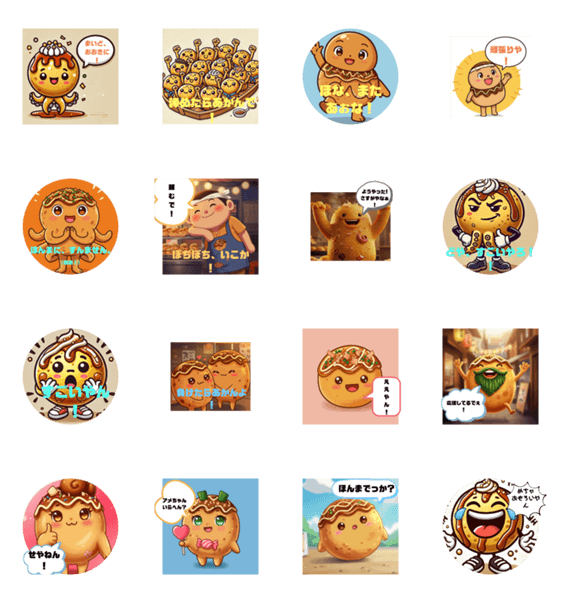 | スタンプ説明 | 元気が出る関西弁と可愛いタコ焼きキャラでトークを盛り上げよう!日常会話や応援に使えるスタンプで、友達や家族とのコミュニケーションがもっと楽しくなる! |