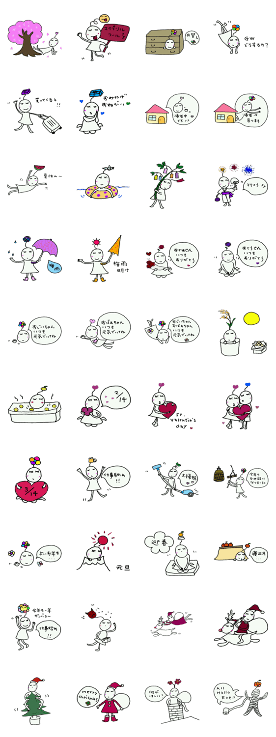 | スタンプ説明 | 幸運の種から花を咲かせる幸運の花こさん。2つ目は、イベントに使いやすいスタンプです。 |