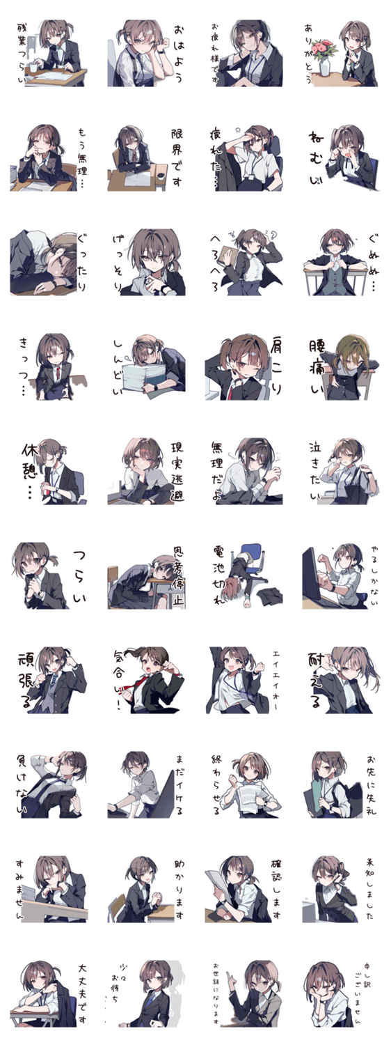 残業女子必見!仕事や業務との戦いに疲れたけど頑張る女性のスタンプ。オフィス/上司/同僚/深夜/元気/励まし