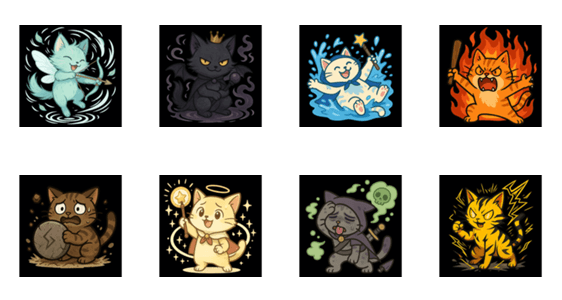 | スタンプ説明 | A bunch of elemental cats on their first adventure! Each has its own role and powercute, chaotic, and full of surprises! |