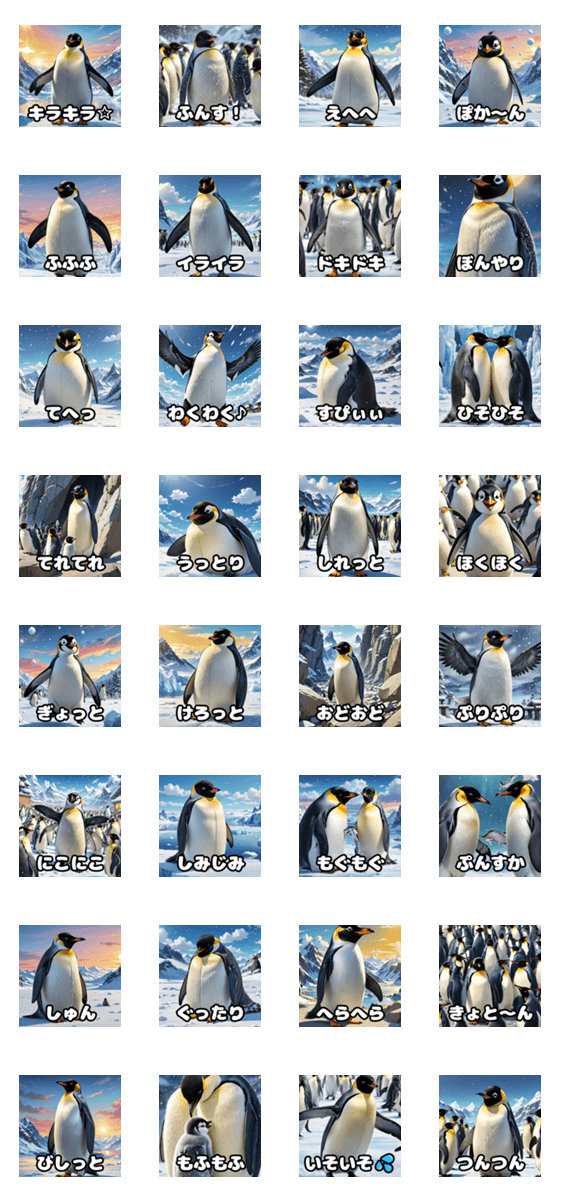キュートでちょっとシュールな皇帝ペンギンのスタンプです。感情表現が豊かすぎて、あなたのトークがさらに楽しくなること間違いなし!