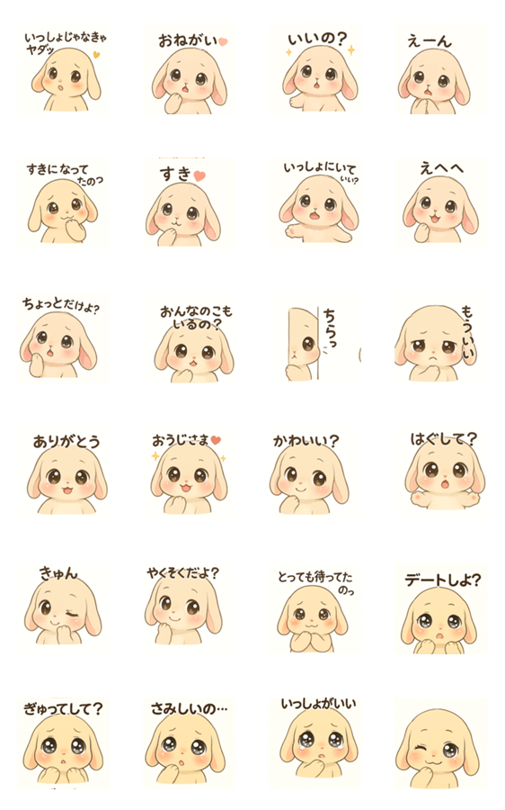 「ちらっ」「やくそくだよ?」「はぐして?」 かわいくてちょっぴりせつない気持ちを伝える、きゅんきゅん系うさぎスタンプです♡