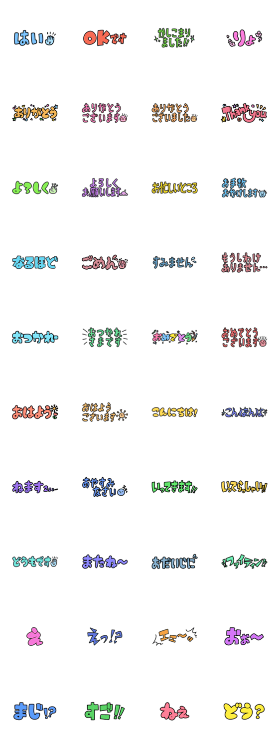 色々な場面で活躍できるスタンプです。高さが低めで省スペースに使えます。 挨拶/敬語/ひとこと/省スペース/文字/文章/シンプル/カラフル/ポップ