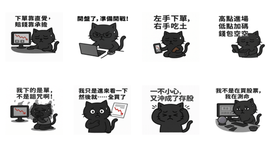 This sticker set captures the emotional rollercoaster of day-trading: from confident morning optimism to evening soul-crushing losses.