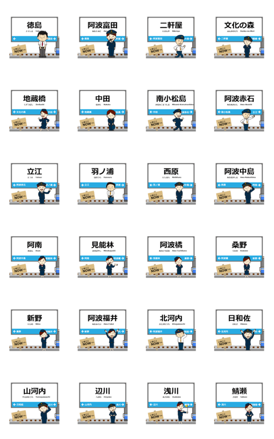 徳島,阿南,羽ノ浦,南小松島,二軒屋,阿波富田,中田,地蔵橋,阿波赤石,見能林,阿波中島,文化の森,立江,日和佐,牟岐,阿波海南,西原,桑野,新野,阿波橘,由岐,阿波福井,北河内