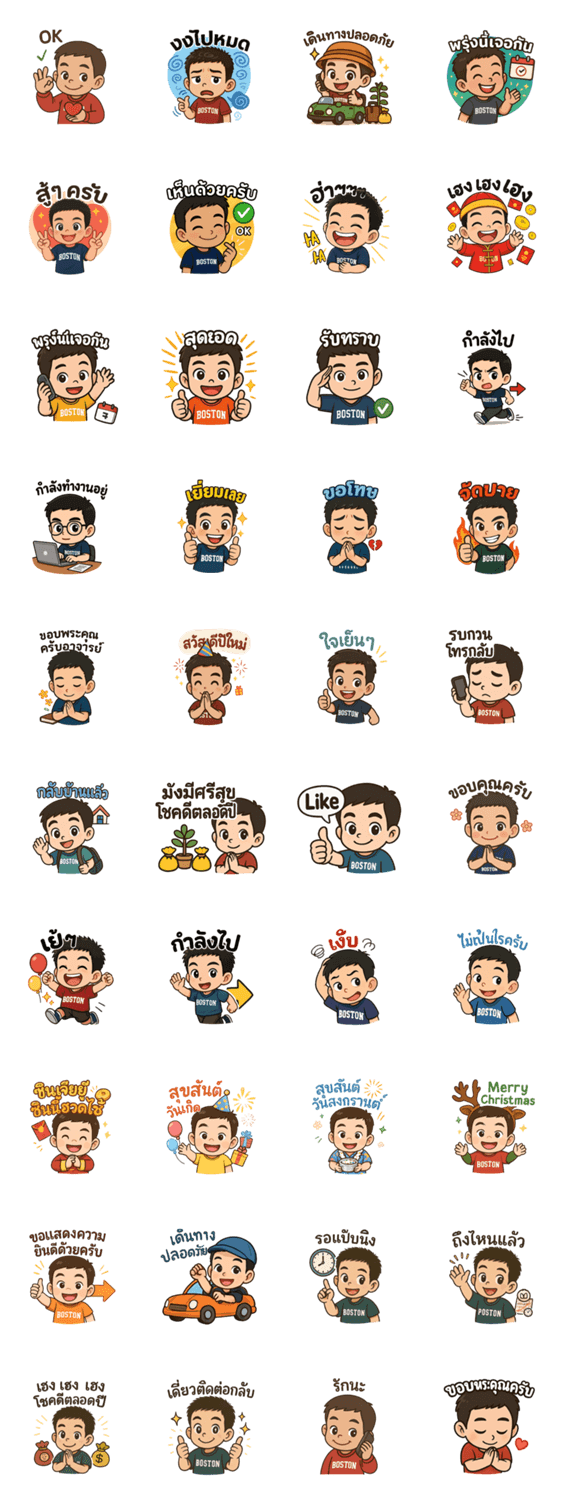 "Boston Pop! is a fun and expressive sticker set featuring a cheerful boy who shares emotions, greetings, and good vibes in a cute, chibi-style design."