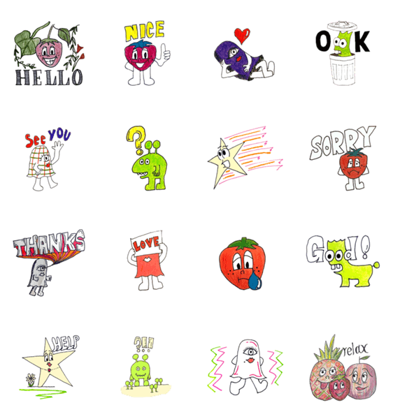 緑のエイリアン、表情豊かな苺くんなど、多様な生物が鮮やかに躍動するスタンプ!