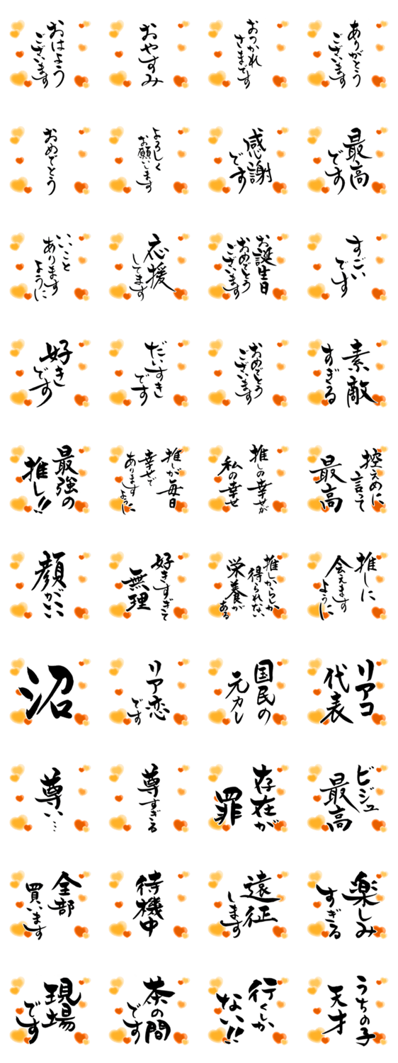 | スタンプ説明 | 橙色担さんが推し活で使える筆文字スタンプです! 日常でも使える挨拶文も入っているので、いつでも推しを感じれます♪ 顔がいい/好きすぎて無理/国民の元カレ/リア恋です/ |