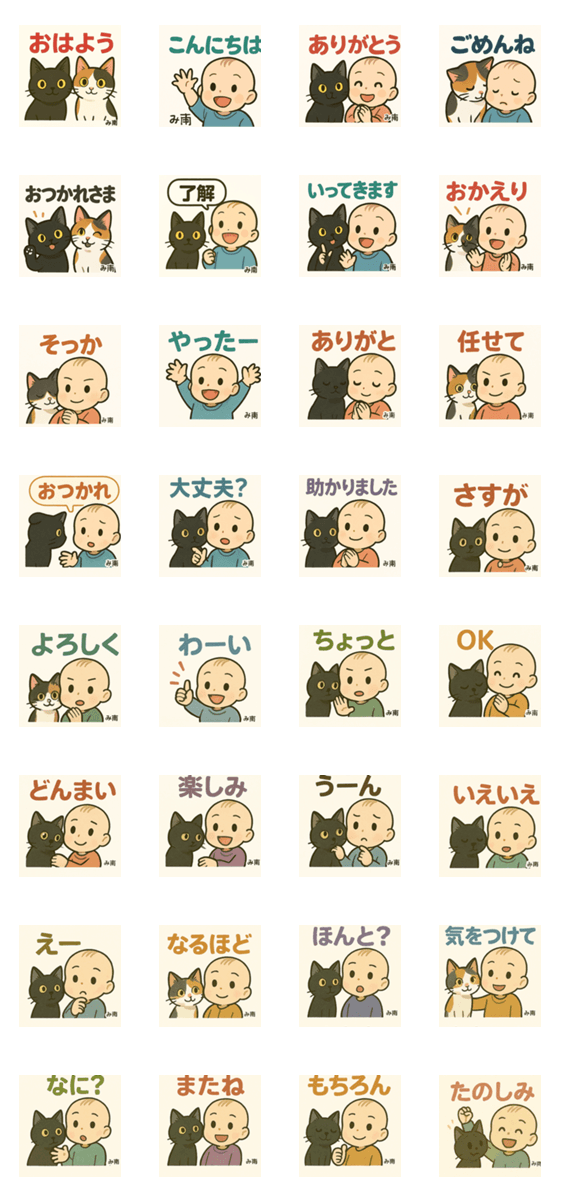 赤ちゃんと黒猫&三毛猫の毎日がスタンプに!使いやすくて癒されるほっこりスタンプ。